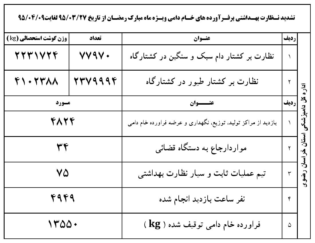 بازدید: 772 تشدید نظارت بر فراورده های خام دامی ویژه ماه مبارک رمضان تشدید نظارت بر فراورده های خام دامی ویژه ماه مبارک رمضان از تاریخ 95/3/27 لغایت 95/4/9 قبلی بعدی