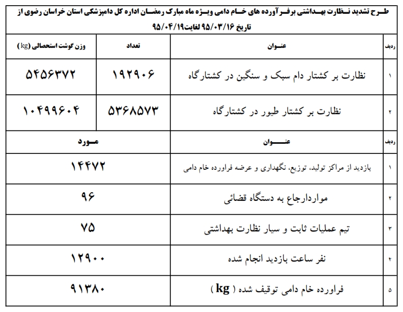 بازدید: 715 طرح تشدید نظارت بهداشتی بر فراورده های خام دامی ویژه ماه مبارک رمضان از تاریخ 95/3/16 لغایت 95/4/19 طرح تشدید نظارت بهداشت بر فراورده های خام دامی ویژه ماه مبارک رمضان از تاریخ 95/3/16 لغایت 95/4/19 قبلی بعدی