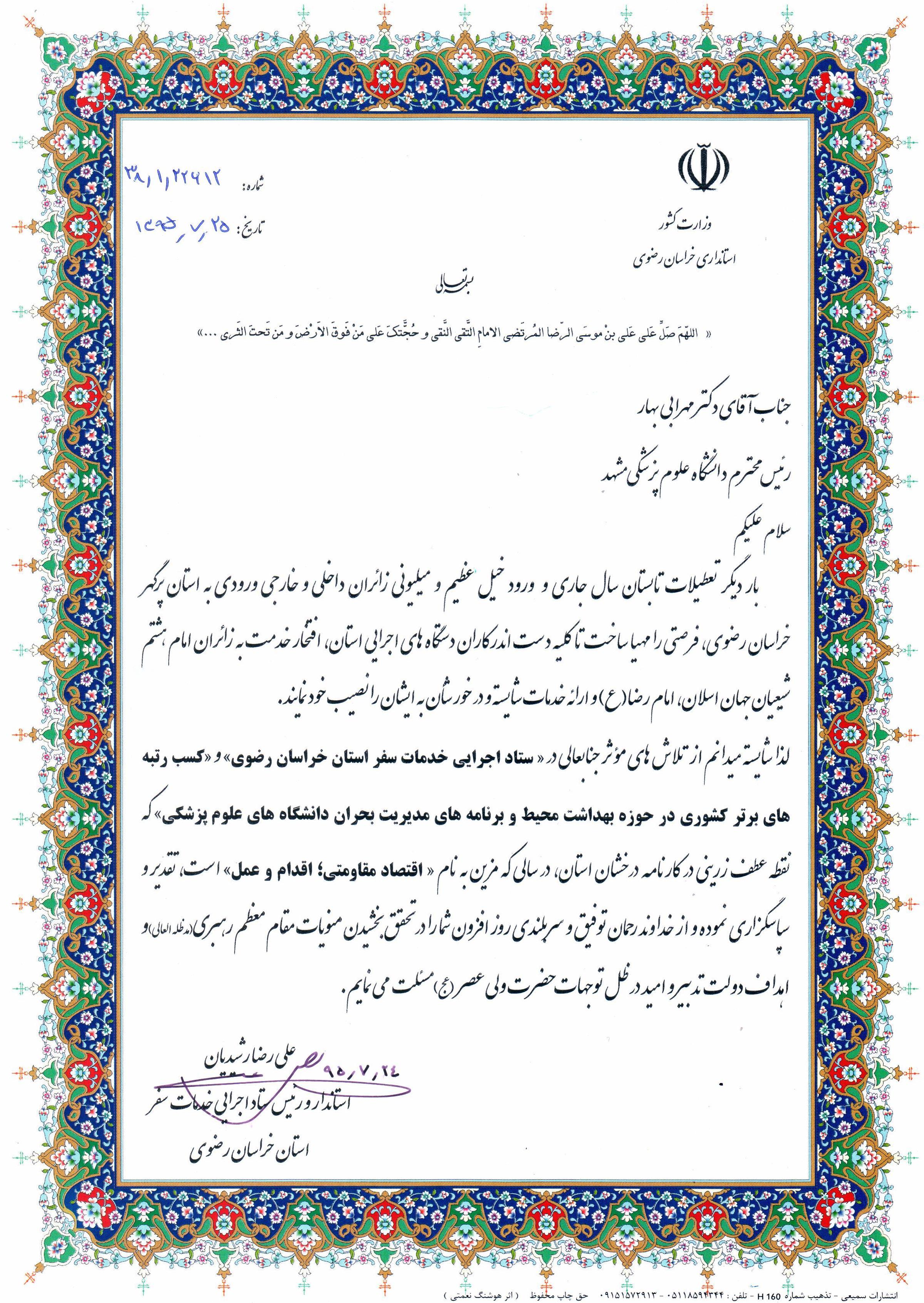 تقدیر استاندار خراسان رضوی از تلاش های دانشگاه علوم پزشکی مشهد در خدمت رساني به زائرين اربعين حسيني و دهه پایانی صفر |